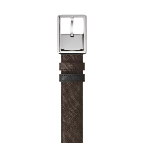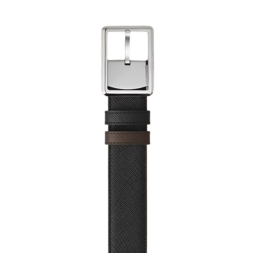 Scopri la raffinata versatilità di questa cintura reversibile da 30 mm in pelle. Questa fibbia rettangolare formale, finitura palladio lucido, apporta un tocco elegante ai look più formali. La cintura è realizzata in pelle Sartorial goffrata con un lato in classico nero e l’altro in una ricca sfumatura ebano si declina in maniera versatile e sobria per completare la tua tenuta.